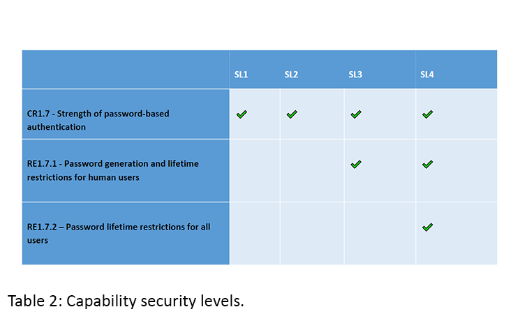 An FR is a group of sets, each consisting of one CR and likely some REs. This gets a bit dense, so I will use an example to illustrate how this works. Table 2 shows an evaluation based on component requirement CR1.7 that covers “strength of password-based authentication” and is contained in the first FR category (Identification and Authentication Control). There are two REs associated with CR7.1.