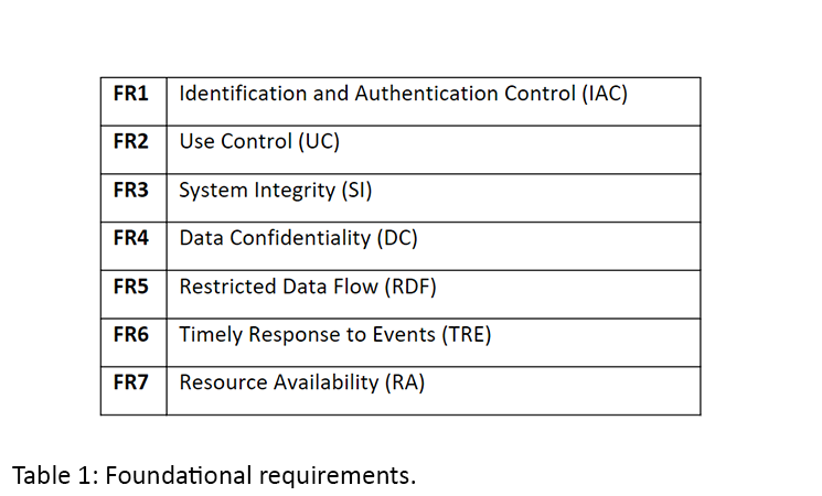 The product’s SLC must be evaluated, and a security level applied to it. This evaluation is based on a list of Component Requirements (CRs) and their associated Requirement Enhancements (REs). They are grouped in categories called Foundational Requirements (FRs) as shown in Table 1. This evaluation must be repeated across all CR/RE groups belonging to each FR category and the total security level for the product is the minimum security level it achieves through all the evaluations.