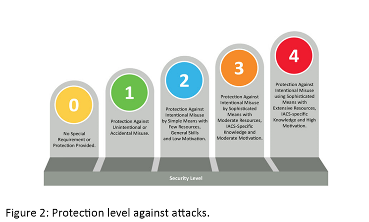 ISA/IEC 62443 is built on the security levels shown in Figure 2 that define the protection level provided against attacks. This ultimately results in a risk assessment that reveals a Target Security Level (SL-T) for the standard as a whole. Based on this SL-T, the asset owner and system integrator can then buy subsystems and components and implement the IACS to meet the security needs of the system. Each component and subsystem is characterized by a Capability Security Level (SL-C). The system implementation is evaluated by the asset owner to verify whether the product’s required security level is being met.