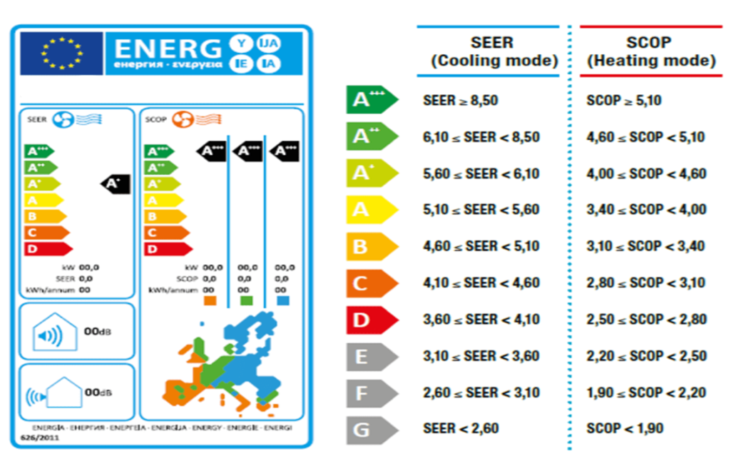 Two terms are used for rating the efficiency of a heat pump and AC unit;- SCOP/Seasonal Coefficient of Performance for heating mode.