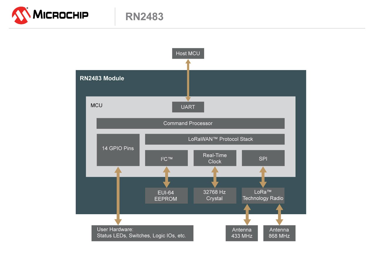 The RN2483 module comes with the LoRaWAN protocol stack, so it can easily connect with the established and rapidly expanding LoRa Alliance infrastructure—including both privately managed local area networks (LANs) and telecom-operated public networks—to create Low Power Wide Area Networks (LPWANs) with nationwide coverage. This stack integration also enables the module to be used with any microcontroller that has a UART interface, including hundreds of Microchip’s PIC® MCUs. Additionally, the RN2483 features Microchip’s simple ASCII command interface for easy configuration and control.