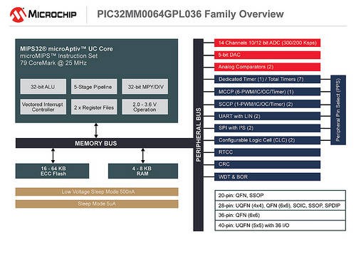 The PIC32MM family is available in mass production today in 20-pin QFN and SSOP; 28-pin uQFN, QFN, SOIC, SSOP, SPDIP; 36-pin QFN; and 40-pin uQFN packaging. Devices are available in 16 KB, 32 KB, and 64 KB Flash variants, with volume pricing starting at $0.60 USD.