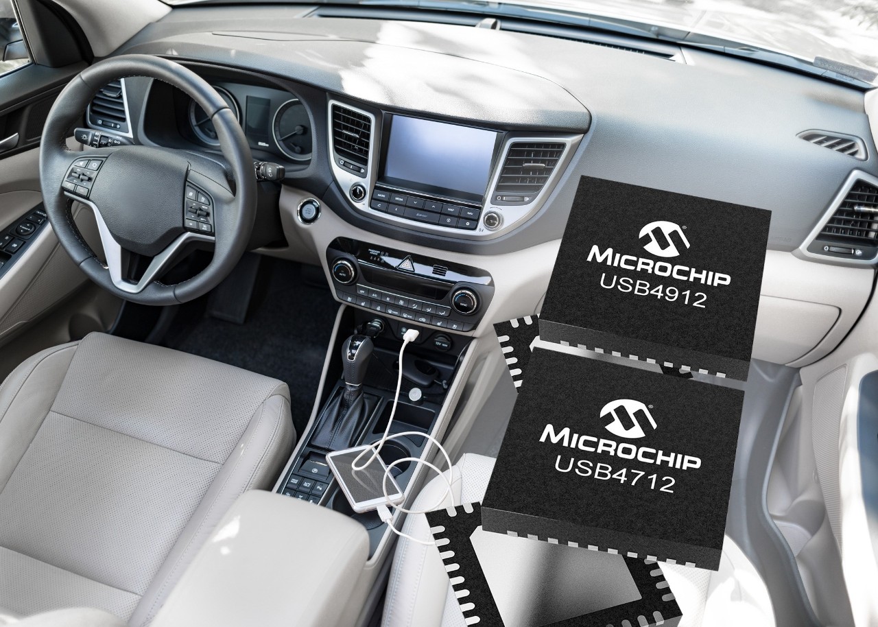 CHANDLER, Ariz., June 10, 2019 — As demand for in-vehicle entertainment and smartphone applications continues to grow, automotive manufacturers must provide dependable and convenient connectivity in designs — all while optimizing system costs. Extending its portfolio of leading USB automotive products, Microchip Technology Inc. (Nasdaq: MCHP) today introduced new single-port products to its USB 2.0 Smart Hub IC family, giving automakers more options to fit varying design needs. Providing precisely what is required for single-port implementations, the USB4912 and the USB4712 are ideal for adding a single port under the radio, in the center console or alongside wireless charging implementations.