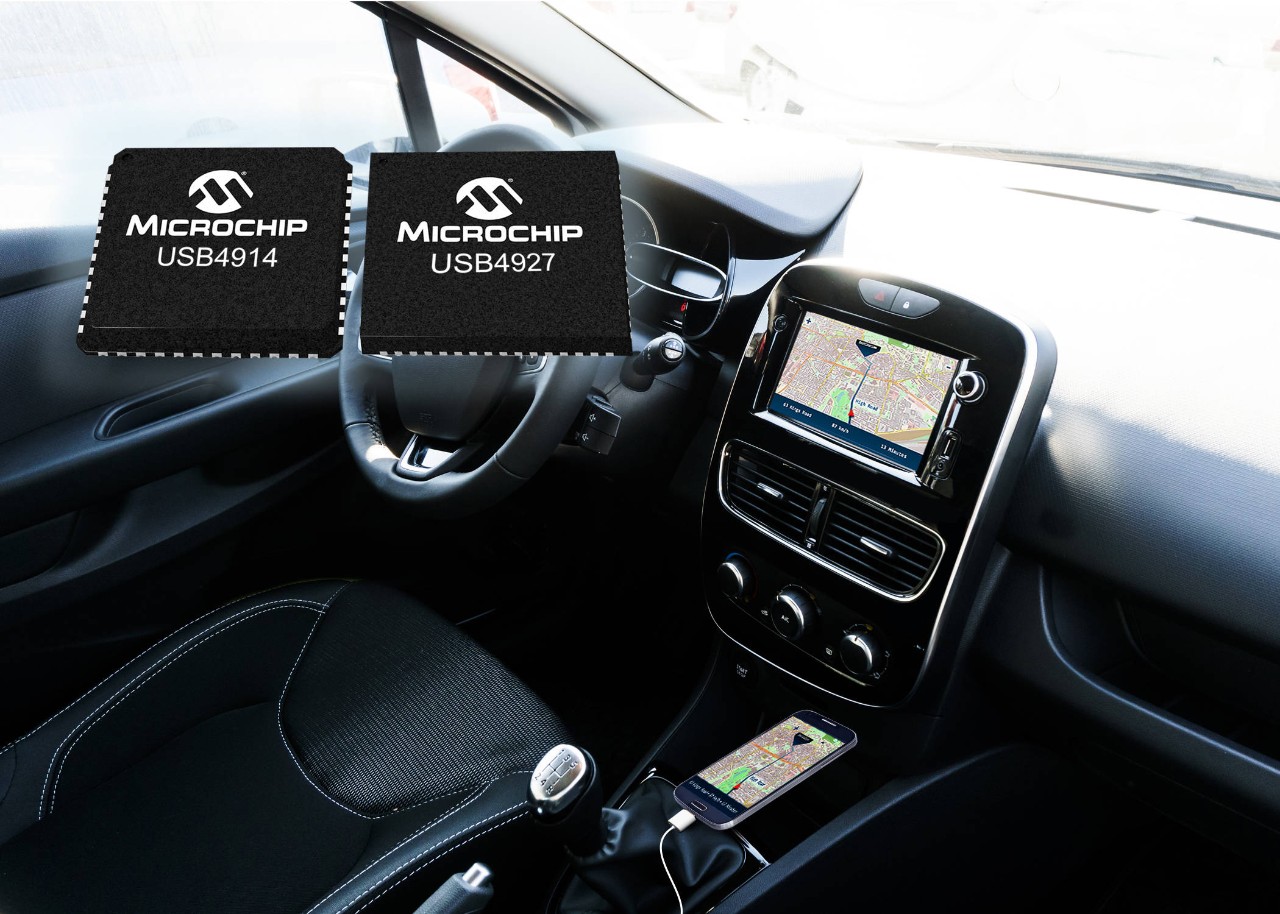 CHANDLER, Ariz., Oct. 23, 2017 — With the rise in in-vehicle infotainment systems, car manufacturers need to provide a reliable, intelligent connection between the car’s display and one or more smartphones or tablets. Microchip Technology Inc. (NASDAQ: MCHP), the industry leader in supplying the integrated circuits (ICs) that enable these connections, provides unrivaled options with its five new USB 2.0 smart hub ICs. These devices, available in a variety of architectures, offer greatly increased flexibility to fit car manufacturers’ design needs and meet consumer demand for easy-to-use, intuitive systems. To learn more about the new devices visit: www.microchip.com/usb4914.