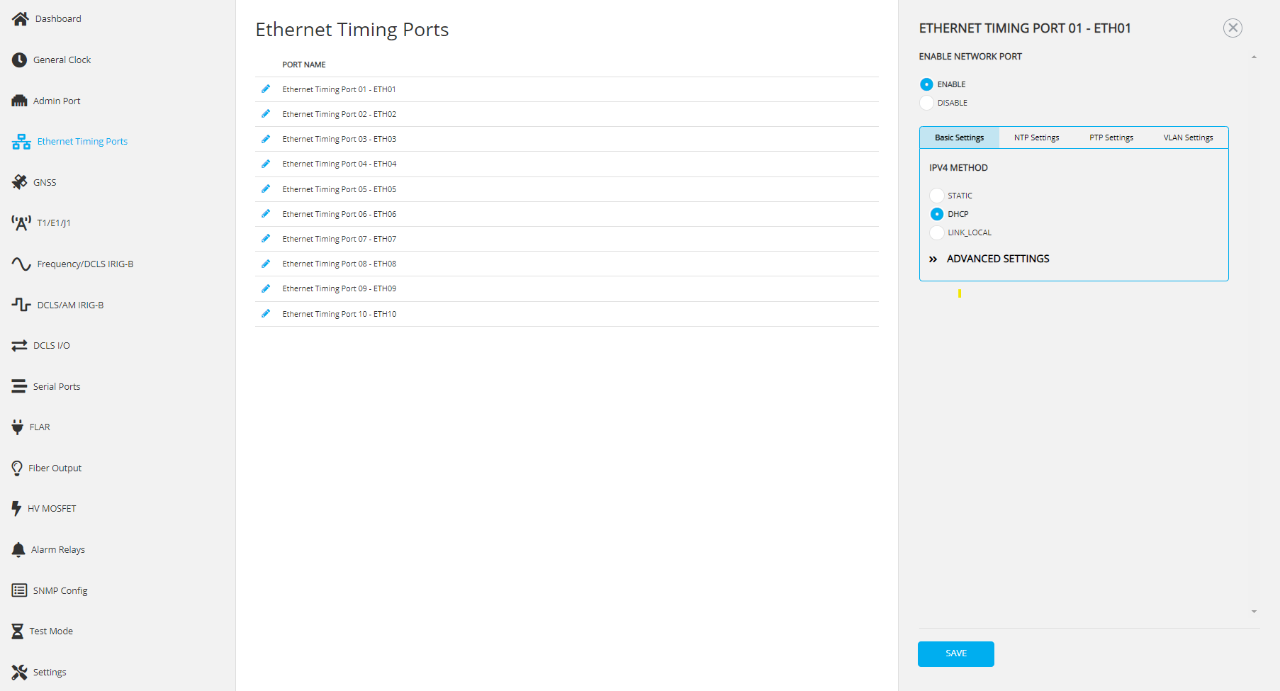 The GridTime 3000 GNSS time server has 10 dedicated 1 Gb Ethernet ports, each equipped with NTP and PTP capabilities. These are connected to a dedicated microprocessor (MPU) to ensure precise and accurate time stamping of packets.