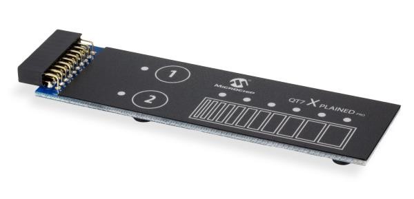 This board features a curved mutual-capacitance slider, two mutual-capacitance buttons and 16 LEDs to demonstrate how to create an attractive touch interface using the Peripheral Touch Controller (PTC).