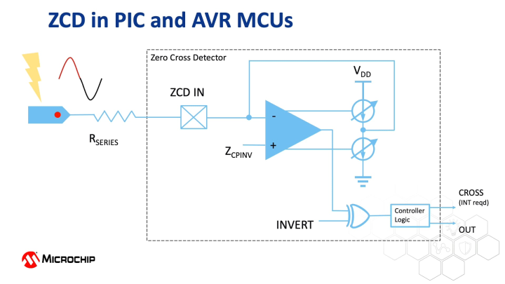 The on-chip ZCD peripheral in PIC® and AVR® MCUs can take the signal directly from the AC main with only a resistor or a capacitor in series. This saves BOM costs and reduces energy loss while also preventing substrate current injection.