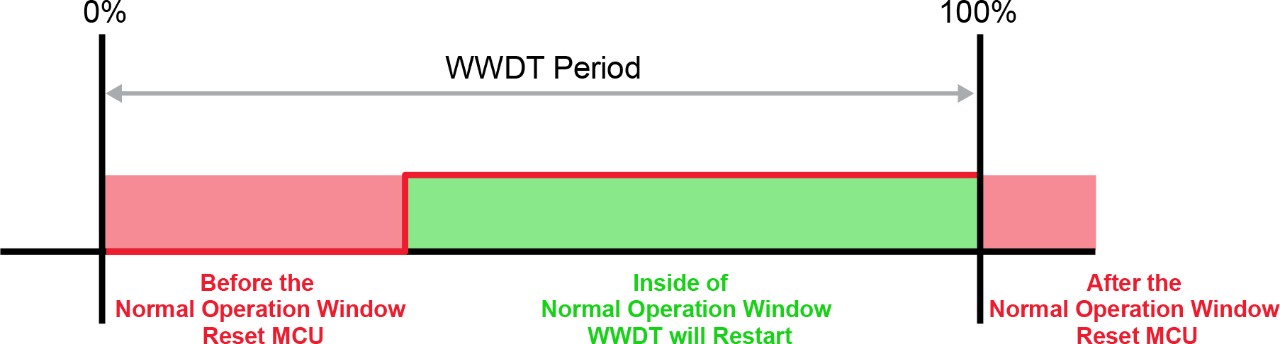 The WWDT is a built-in hardware module for most modern PIC and AVR MCUs. The WWDT uses the internal oscillator as clock source and offers a variable time-out period and window sizes. When the application starts, the WWDT starts counting to its pre-programmed time. User-written code clears the WWDT within the pre-defined time window, and the process starts over again. If the timer is not cleared during the pre-defined time window, then the WWDT issues a reset of the MCU.