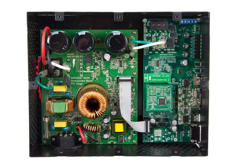 This development board is designed to demonstrate the features of the dsPIC33EDV64MC205 System in Package (SiP). It can drive low-voltage, three-phase BLDC/PMSM motors and comes programmed to run dual-shunt FOC with PLL estimator using the Hurst BLDC motor as the out-of-the-box demo