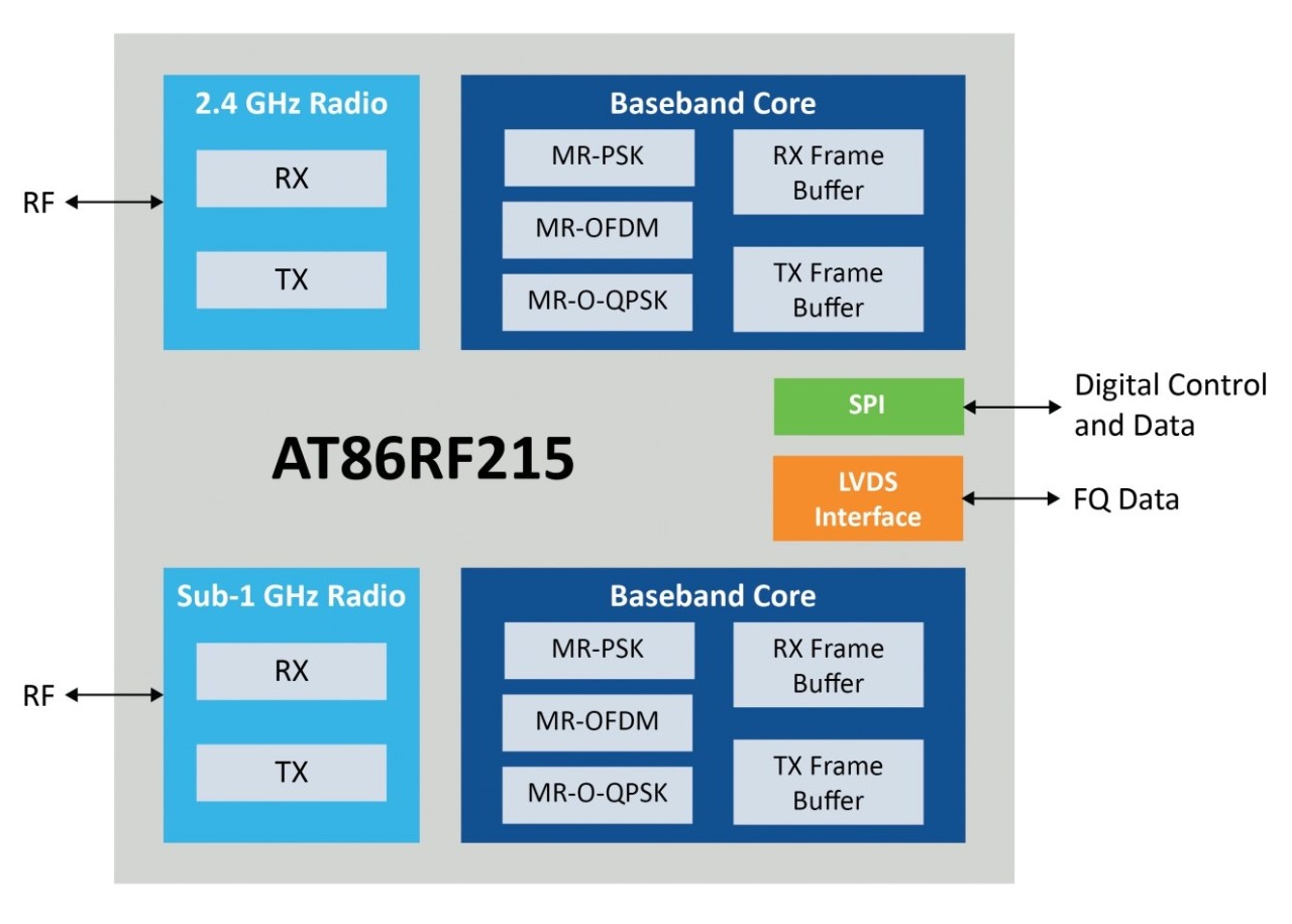 The AT86RF215 is a dual-band sub-1 GHz/2.4 GHz transceiver compliant to IEEE 802.15.4g-2012 and ETSI TS 102 887-1. An output power of 14 dBm and receiver sensitivities down to −123 dBm result in an outstanding link budget of up to 137 dB. This highly flexible device supports a variety of data rates with three modulation schemes: Multi-Rate and Multi-Regional Frequency Shift Keying (MR-FSK), Orthogonal Frequency Division Multiplexing (MR-OFDM), as well as Offset Quadrature Phase-Shift Keying (MR-O-QPSK). Simultaneous operation at sub-1 GHz and 2.4 GHz enables new capabilities and the right cost structure in smart metering, smart lighting, home energy gateways and other industrial and automation equipment.