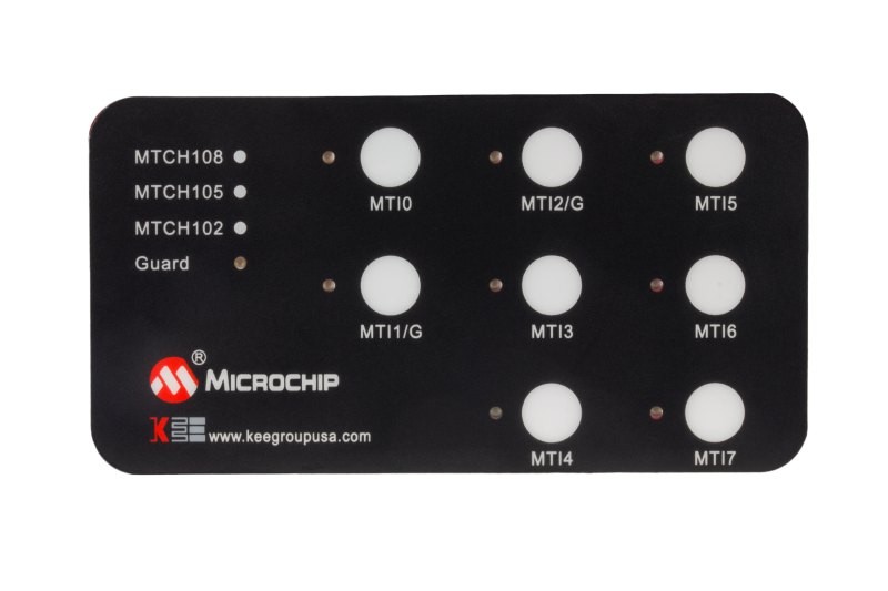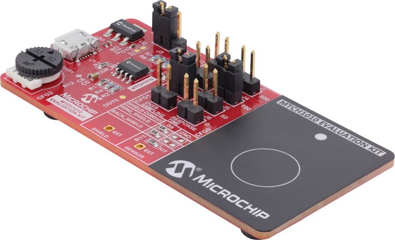 This evaluation kit provides an easy-to-use platform for evaluating the MTCH108 capacitive touch controller. It features different button sizes and a proximity sensor.