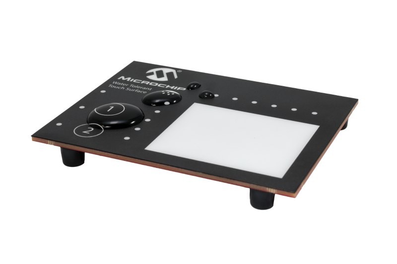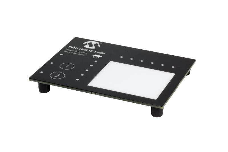 This development kit enables easy evaluation of a water-tolerant design that uses the 2D Touch Surface Library. The kit demonstrates water tolerance and noise immunity on a touchpad and has two touch buttons, all of which are controlled by the same PIC microcontroller. It features dual-finger gesture recognition on chip, including swipes, tap events, dual finger swipes, rotations and even pinch/zoom gestures.