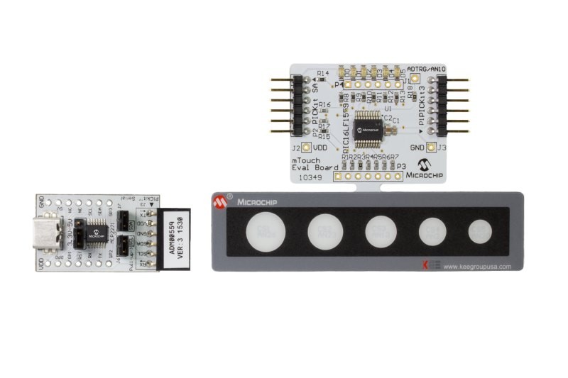 This evaluation kit is a platform to evaluate and develop capacitive touch applications using mTouch technology. The kit demonstrates proximity sensing as well as touch on different button sizes using a driven shield for better noise performance while simultaneously being immune to false touches due to water on the touch surface.