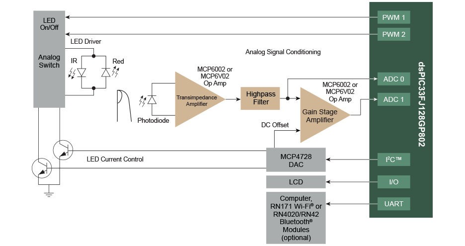 Pulse Oximeter Demo ‘C’ source code, application notes and schematics are available for this demo.