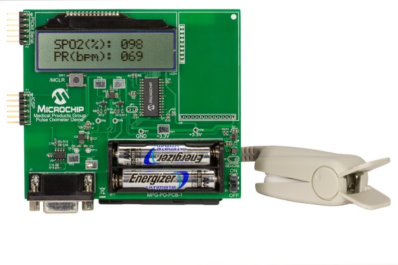 Microchip’s pulse oximeter reference design demo board helps designers develop a low-cost, low power handheld or wearable pulse oximeter with user interface which is capable of measuring both heart rate and blood oxygen level. It can be used to start development of a hospital or clinical pulse oximeter design, but it can also be used as a starting point for the development of a wearable activity tracker design that can measure heart rate and blood oxygen level.