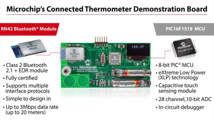Microchip's Connected Thermometer Board demonstrates the implementation of a Bluetooth®-connected digital thermometer using Microchip's PIC16F1519 MCU and RN42 Bluetooth Module. The PIC16F1519 MCU is an eXtreme Low Power (XLP), cost-effective 8-bit microcontroller with an integrated capacitive touch sensing module. Connectivity is demonstrated on this board by the use of Microchip's fully qualified RN42 Bluetooth2.1 + EDR Module. This demo design can also be easily implemented using any of Microchip's Bluetooth Low Energy or Wi-Fi® connectivity modules.