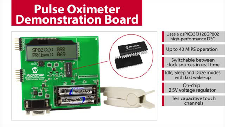 Microchip’s pulse oximeter reference design demo board helps designers develop a low-cost, low power handheld or wearable pulse oximeter with user interface which is capable of measuring both heart rate and blood oxygen level. It can be used to start development of a hospital or clinical pulse oximeter design, but it can also be used as a starting point for the development of a wearable activity tracker design that can measure heart rate and blood oxygen level.