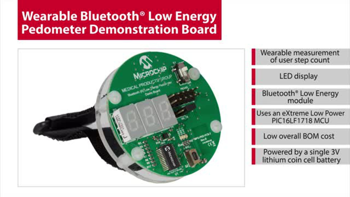 Microchip’s wearable Bluetooth Low Energy pedometer reference design demo helps designers develop a low-cost, low-power, wearable pedometer with both an on-board LED display as well as Bluetooth Low Energy capability to connect to smartphones and tablets. This demo board can be used as a basic wearable step count activity tracker design, but it can also be used as a development platform for the design of more advanced activity tracker functions such as distance traveled or calories burned. Also, additional biometric measurement capability can be added using other Microchip medical reference demo designs.