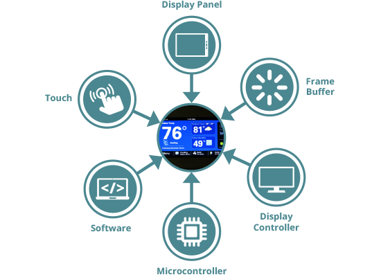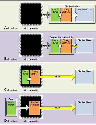 The display glass must be constantly refreshed by feeding the horizontal and vertical pixel data repeatedly from the frame buffer. This can be achieved in two ways: