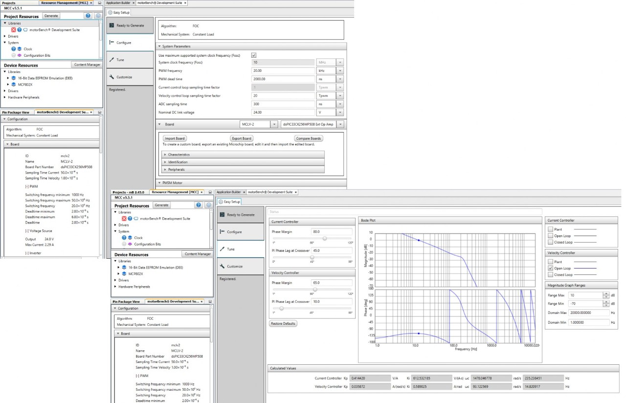 The motorBench® Development Suite is a GUI-based software development tool for Field-Oriented Control (FOC) that accurately measures critical motor parameters, automatically tunes feedback control gains and generates source code for an MPLAB® X IDE project by utilizing the Motor Control Application Framework (MCAF). This graphical, interactive development environment helps motor control embedded engineers save time in starting up and running new motors with no load or a constant load, especially when the motor parameters are unknown. The motorBench Development Suite is a library in MPLAB Code Configurator (MCC), a plug-in for MPLAB X IDE.