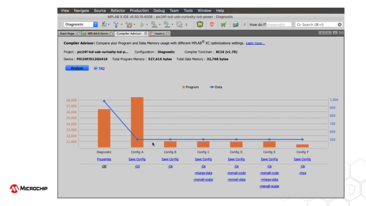 Compiler optimizations are a key part of our MPLAB XC compilers and with Compiler Advisor, selecting the best optimization for your design is just a few clicks away. Compiler Advisor is a free tool to determine which optimizations will best suit your specific project. Available in version 6.0 of MPLAB X IDE, Compiler Advisor will test multiple builds of your project using a variety of MPLAB XC Compiler optimizations and return the data usage and program size in a helpful visual chart. From the chart, you can look at the different optimizations used for each test build image and save the best configuration to apply that set of optimizations right into your program.